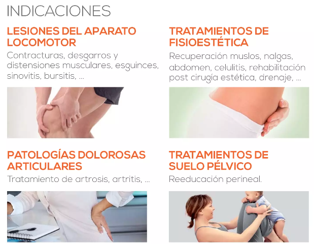 * Fisioterapia deportiva: descarga muscular, preparación al esfuerzo, prevención de lesiones, mejora de la fatiga muscular, traumatismos directos e indirectos.